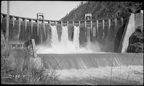Alcoa began developing the Little Tennessee Valley in 1909 to provide the enormous amounts of electricity needed to power to its aluminum smelting operations in Blount County. Superintendent I.G. Calderwood oversaw the extension of a railway line from Chilhowee to what is now Calderwood (railroad bridge support columns are still visible in the river just downstream from the dam). Southern Railway engineers had suggested that the construction of this rail line would take six months, but Calderwood and his team accomplished the task in just six weeks.[6] The first of Alcoa's Little Tennessee Valley dams, Cheoah, was completed in 1919, and the second, Santeetlah, was completed in 1928.[5] Preliminary work on Calderwood Dam began in 1918, but test drilling suggested the site might not be satisfactory. Subsequent tests confirmed the site's stability, however, and construction began in 1927. The first two generating units went into operation on June 22, 1930, and a third unit was added in 1938.[3]