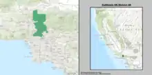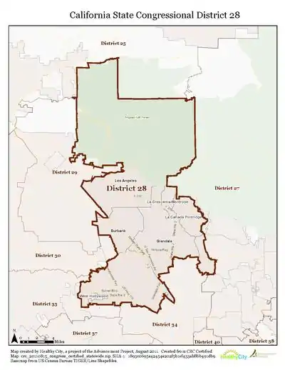 The district includes West Hollywood, Burbank, parts of Pasadena, Glendale, the Verdugo Hills communities of Sunland and Tujunga, as well as parts of central Los Angeles including Hollywood, the Hollywood Hills, Echo Park, Silver Lake, and Los Feliz. As it includes Glendale and Little Armenia, it has the largest Armenian-American population of any district in the country (Schiff cites the Armenian population at greater than 70,000).[5][6] The district also includes two of Southern California's more significant gay enclaves, West Hollywood and Silverlake.