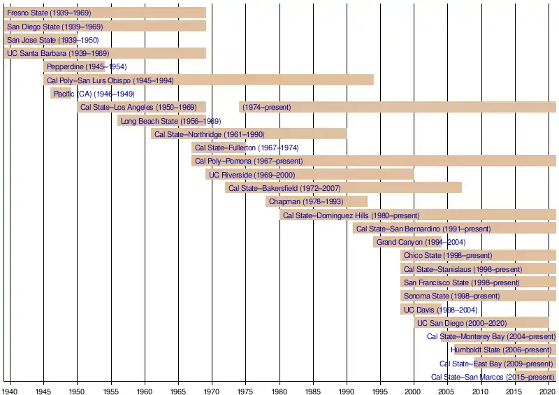- Big West Conference, a Division I conference that consists predominantly of California schools. Of its 11 current members, nine (Hawaii and UC Irvine being the exceptions) are former members of the CCAA.