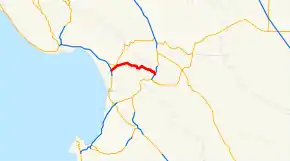 Except where prefixed with a letter, postmiles were measured on the road as it was in 1964, based on the alignment that existed at the time, and do not necessarily reflect current mileage. R reflects a realignment in the route since then, M indicates a second realignment, L refers an overlap due to a correction or change, and T indicates postmiles classified as temporary (for a full list of prefixes, see the list of postmile definitions).[1] Segments that remain unconstructed or have been relinquished to local control may be omitted. The numbers reset at county lines; the start and end postmiles in each county are given in the county column.