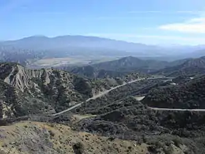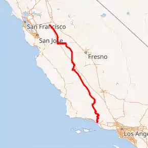 Several segments of this route are part of the California Freeway and Expressway System,[2] but only a small portion near SR 152 is part of the National Highway System,[3] a network of highways that are considered essential to the country's economy, defense, and mobility by the Federal Highway Administration.[4] Several segments are eligible to be included in the State Scenic Highway System;[5] however, only the portion from 6.4 miles north of the SR 150 junction to the Ventura–Santa Barbara county line is a scenic highway as designated by Caltrans,[6] meaning that it is a substantial section of highway passing through a "memorable landscape" with no "visual intrusions", where the potential designation has gained popular favor with the community.[7] This scenic segment is also designated as part of the Jacinto Reyes Scenic Byway, a National Forest Scenic Byway.[8]