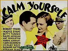 Calm Yourself is a 1935 American comedy film directed by George B. Seitz and written by Arthur Kober. The film stars Robert Young, Madge Evans, Betty Furness, Ralph Morgan, Nat Pendleton and Hardie Albright. The film was released on June 28, 1935, by Metro-Goldwyn-Mayer.[1][2]