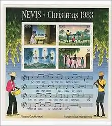 In 1983, the Caribbean island of Nevis featured the chorus of "Calypso Carol" on a miniature sheet of its 1983 Christmas stamps, designed by Jennifer Toombs.[4] The neighbouring island of St Kitts issued a complementary sheet with the slightly older song "Mary's Boy Child".