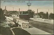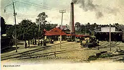 The Preston post office opened in 1837 and the population continued to grow primarily because of immigration from Germany. Preston was incorporated as a village in 1853. The population declined in the late 1800s but by 1900, it had increased to 2,000 partly because of the new electric railway systems that started in 1894. In 1911, the line reached Hespeler, Berlin (later called Kitchener) and Waterloo; by 1916 it had been extended to Brantford/Port Dover.[15] This made visiting other communities and carrying of goods very convenient.[27]