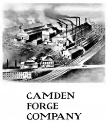 The Camden Forge Company (or Camden Forge for short) was an American steel forging company founded in 1901 and shut down during 1956,[1][2] supplying custom forgings for anything from rods and bolts to steers and axles. The company's original address was the corner of Mount Ephraim Avenue and Bulson Avenue in Camden, NJ. After a few years the official address was changed to Mount Ephraim Avenue and the Atlantic City Railroad.[3][4] During both World War I and World War II, they supplied materials for ships made by New York Shipbuilding Company.[5] In July of 1942, the company received the award for the Army and Navy "E" pennant for excellency in the production of war materials. The pennant received had 5 stars.[6] Closing in 1956, the company went to public auction on April 10, 1956, at auction the company was worth $8,500,000.[7] Camden Forge's Commercial and Government Entity code is 10399.[8]