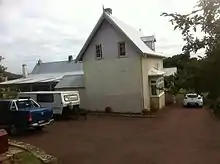 The house is a simple colonial design, rectangular in shape with a steeply pitched gable corrugated iron roof. The walls are coated in stucco and have three sets of casement windows set over the verandah. Four chimneys are set asymmetrically around the house. The school is a two-storey brick building with a steeply pitched gabled corrugated iron roof. It has exposed brick on one side and is whitewashed on the others.[3]
