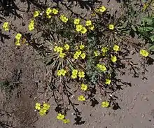 Camissoniopsis bistorta is a species of flowering plant in the evening primrose family known by the common names southern suncup and California suncup. It is native to southern California and Baja California, where it grows in several types of plant community along the coast and in the coastal hills and mountain ranges. This is a hairy annual or perennial herb spreading from a basal rosette with stems reaching up to 80 centimeters long. Leaves are lance-shaped to narrowly arrowhead-shaped and sometimes toothed, and 1 to 12 centimeters in length. Toward the end of the spreading stems are nodding inflorescences of flowers, each flower with four bright yellow petals dotted with red at their bases. At the center are stamens and a protruding, nearly spherical stigma. The fruit is a straight or slightly coiled capsule up to 4 centimeters long.