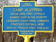 Camp Alvernia is a non-profit recreational summer camp in Centerport, New York on the North Shore of Long Island. The camp is located on the east shore of Centerport Harbor, on the Little Neck peninsula. It was founded in 1888 by the Franciscan Brothers of Brooklyn, who still run the facility now, over 120 years later.[1] Alvernia was the first, and is now the oldest Catholic camp in continuous operation in the United States.