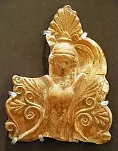 - Cladding tiles: On the upper border, where the tile forms a smooth edge, there was decoration with an egg and dart pattern and the lower border is decorated with Lotus, palmettes, and anthemia. The lower edge follows the contour of the decorative pattern. There were three or four holes in each tile, through which tiles were tied to the wall.[14]