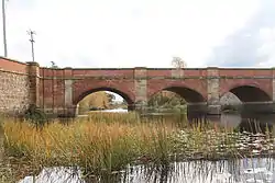 One of Campbell Town's features is the convict-built Red Bridge, the oldest bridge on the National Highway. The bridge and causeway were built as a part of the original main road; it was to be a part of Bell's line of Road, but this road never got past Oatlands. Construction was commenced in 1836 and completed in 1838.[16] It consists of drystone abutments and timber top, although the top has been replaced, the stone abutments are original, making this a rare example of early Australian stone work.