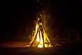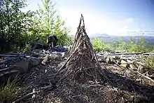 The tipi (or teepee) fire-build takes some patience to construct. First, the tinder is piled up in a compact heap. The smaller kindling is arranged around it, like the poles of a tipi. For added strength, it may be possible to lash some of the sticks together. A tripod lashing is quite difficult to execute with small sticks, so a clove hitch should suffice. (Synthetic rope should be avoided since it produces pollutants when it burns.) Then the larger kindling is arranged above the smaller kindling, taking care not to collapse the tipi. A separate tipi as a shell around the first one may work better. Tipi fires are excellent for producing heat to keep people warm. The gases from the bottom quickly come to the top as you add more sticks.[8]