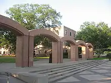 Facilities for the Corps of Cadets are located in the Quadrangle, or "The Quad", an area consisting of dormitories, Duncan Dining Hall, and the Corps training fields.[56] The Corps Arches, a series of 12 arches that "[symbolize] the undying spirit of the 12th Man of Texas A&M", mark the entrance to the Quadrangle.[57] All cadets, except those who are married or who have had previous military service, must live in the Quad with assigned roommates from the same unit and graduating class. Reveille, the Aggie mascot, lives with her handlers in the Quadrangle.[58]