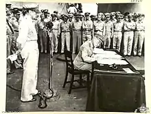 Col. Lawrence Moore Cosgrave, signs the Japanese Instrument of Surrender as Canada's representative on the USS Missouri.