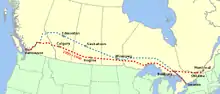The schedule was lengthened again effective July 26, 2018 to four days and four nights in each direction due to continuing schedule reliability problems on the host railway.[13] The Canadian currently takes 94 hours 15 minutes westbound[14] vs. 95 hours 29 minutes eastbound.[15] This is 13h50m vs. 12h19m slower than the Continental's 80h25m vs. 83h10m[16] and 13h5m vs. 12h24m slower than the Dominion's 81h10m vs. 83h5m[17] schedules from 1952.