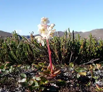 Recent records have identified around 400 species of vascular plants in the region, represented in 42 families and 141 genera of plants.[33] Of the approximately 106 endemic vascular plant species of the region, 34 different species have been identified in central Northern Canada, 20 in the Hudson Bay - Labrador area and 28 on Ellesmere Island. Some endemic plants, such as the Yukon Whitlow-grass (Draba yukonensis) and the Long's northern rockcress (Braya longyi) have become endangered due to industrial activities.[34] In a 2008 expedition to south-west Victoria Island 204 species of vascular plants were recorded and more than 800 species were identified for the region.[35]