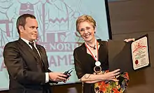 ![]() Brad Mackay (left), Director of the Doug Wright Awards, inducts Lynn Johnston into The Giants of the North: the Canadian Cartoonists Hall of Fame in August 2008 | |