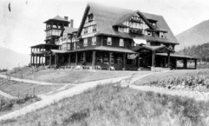 Hotels were established mainly at locations that connected with other passenger rail or ferry routes, but some rural locations, especially in the Canadian Rockies/Selkirk Mountains, became tourist destinations in their own right. After the success of the original Banff Springs Hotel, described as a "Tudor chalet in wood",[5] CPR lobbied the government to create Banff National Park, the first in Canada.[6] Indisputably, national parks protected CPH's commercial interests in such localities.[7] The opportunity to participate in mountaineering excursions, led by professional Swiss guides, featured in CPH's promotion of the respective accommodation.[8] Scenic images, often including a hotel, illustrated the CPH publicity brochures.[9]