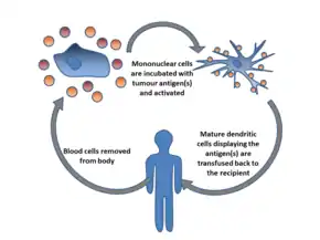 Dendritic cell therapy provokes anti-tumor responses by causing dendritic cells to present tumor antigens to lymphocytes, which activates them, priming them to kill other cells that present the antigen. Dendritic cells are antigen presenting cells (APCs) in the mammalian immune system.[5] In cancer treatment they aid cancer antigen targeting.[6] The only approved cellular cancer therapy based on dendritic cells is sipuleucel-T.