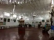 Buildings in which Candomblé is practiced are called terreiros ("houses"),[115] or ilês.[116] These range in size from small houses to large compounds,[113] and consist of a series of rooms, some of which are considered off-limits to non-initiates.[60] They contain an altar to the deities, a space to perform ceremonies, and accommodation for the priests or priestesses.[113] The floor is deemed sacred, consecrated to the tutelary orixá of the house.[117] The bakisse is the "room of the saints", a storeroom containing both ritual paraphernalia and the assentamentos of the orixás,[118] while the roncó ("retreat room") or camarinha is used during initiations.[119] One room, the barracão ("big shed"), is where public rituals, including acts of divination, take place;[120] those which lack such a room may use a yard for public rituals.[121] The terreiro will often have a cumeeira, central pole in the structure believed to link our world with the otherworld of the orixá.[122] This stands above the entoto ("foundation") of the terreiro,[123] a space which is periodically "fed" with offerings.[124] The terreiro's enclosure may have a tree dedicated to Tempo, onto which strips of white cloth have been affixed,[125] as well as a place set aside for the souls of the dead, termed the balé, which is usually at the back of the terreiro grounds.[126] Each terreiro is distinct and operates autonomously,[127] although most venerate between twelve and twenty orixás.[128]
