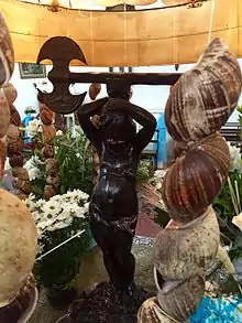 The "seat" of the orixá is called an assentamento.[148] This usually consists of various items placed within an enamel or earthenware basin.[149] The key part of the assentamento is a sacred stone known as an otá.[150] This otá possesses axé,[151] and thus requires feeding.[152] These are kept in ceramic jars alongside ferramentos, or metal objects associated with specific orixá,[153] statues of the associated Roman Catholic saints,[149] and a mix of water, honey, and herbal preparations.[154] They may also include hair from the initiate to whom they belong.[124] The assentamento can be stored in the home,[124] or inside the terreiro's bakisse room.[155] There, the assentamentos of the initiates may be arranged on a multi-level altar, which is decorated with ribbons, colored lights, and flowers.[149]