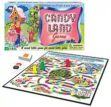 Candy Land (also Candyland) is a simple racing board game currently published by Hasbro. The game requires no reading and minimal counting skills, making it suitable for young children. Due to the design of the game, there is no strategy involved: players are never required to make choices, just follow directions. The winner is predetermined by the shuffle of the cards. A perennial favorite, the game sells about one million copies per year.[1]