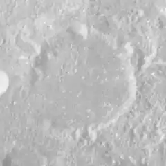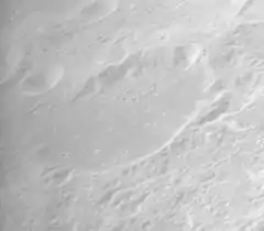 This is a worn and eroded formation with an interior floor that has been resurfaced by lava. A small crater overlies the north rim, which forms a notch in the side. Tiny craters also lie across the rim northeast and at the southern edge. The interior is level and nearly featureless, with only a few tiny scattered craterlets to mark the surface. This floor has the same albedo as the surrounding terrain.
