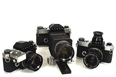 The Canonflex was introduced in May, 1959 by Canon of Tokyo, Japan. It is Canon's first 35 mm single-lens reflex camera. Its standard lens is the Super-Canomatic R 50mm f/1.8, using the first version of Canon's breech-lock manual-focus lens mount, the R lens mount, which would evolve into the Canon FL and Canon FD lens mounts over the next three decades. The Super-Canomatic lens features fully automatic aperture operation, using two internal connections.[2] Canomatic and R-series lenses use semi-automatic or manual diaphragms. Though the breech-lock mount itself remained unchanged until the introduction of the EF lenses for EOS autofocus cameras in the late 1980s, the actuating levers of the Canomatic or R-series lenses operate differently from their FL and FD descendants.