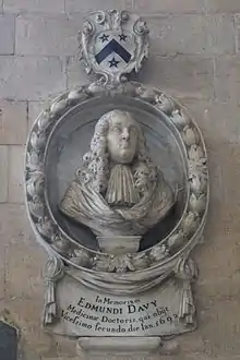 - Dr Edmund Davie (1630–1692), 2nd son, a Doctor of Physick, who lived at the Chantry in Exeter,[24] one of the Worthies of Devon of John Prince (1643–1723), of whom he was an acquaintance. Prince described him as "The great Aesculapius of his time in these western parts".[25] According to Lysons Magna Britannia (1822) he was the last in the male line of the Davie family of Canonteign. His mural monument survives in the south aisle of the Lady Chapel of Exeter Cathedral and displays his sculpted bust, inscribed in Latin as follows: In memoriam Edmundi Davy, Medicinae Doctoris, qui obiit vicessimo secundo die Jan(uarii) 1692 ("In memory of Edmund Davy, Doctor of Medicine, who died on the twenty second day of January 1692"). Above are shown the arms of Davie Argent, a chevron sable between three mullets pierced gules, but with mullets shown sable.
