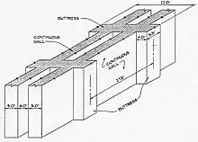 The first and last transverse walls (next to the wing wall abutments) are only 3 feet wide, all the other transverse walls are 5 feet, 6 inches wide. The wing wall abutments are 25 feet wide where they meet the viaduct; they are curved and stepped and were excavated by William Otis using his first steam shovel. From the top of the wing walls to midway down, the stones are of 2' wide; from midway down to the bottom of the wing walls the stones are 4' wide.