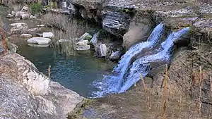 Canyon Lake Gorge is a limestone gorge around 1 mile (1.6 km) long, hundreds of yards (metres) wide, and up to 50 feet (15 m) or more deep, which was exposed in 2002 when extensive flooding of the Guadalupe River led to a huge amount of water going over the spillway from Canyon Lake reservoir and removing the sediment from the gorge. The gorge provides a valuable exposure of rock strata as old as 111 million years showing fossils and a set of dinosaur tracks, and forms a new ecosystem for wildlife with carp and other creatures in a series of pools fed by springs and waterfalls.[1]