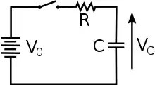 A series circuit containing only a resistor, a capacitor, a switch and a constant DC source of voltage V0 is known as a charging circuit.[30] If the capacitor is initially uncharged while the switch is open, and the switch is closed at t0, it follows from Kirchhoff's voltage law that