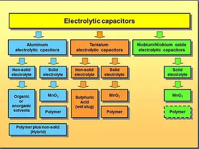 - Aluminum, tantalum and niobium electrolytic capacitors are named after the material used as the anode and the construction of the cathode (electrolyte)