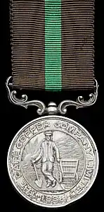 The Cape Copper Company Medal is a silver or bronze medallion, 36.5 millimetres in diameter with a raised rim, depicting the encircled company emblem, a miner with a spade standing next to a mining cocopan, and inscribed "1888" at the bottom and "THE CAPE COPPER COMPANY LIMITED" around the perimeter.[3][7]