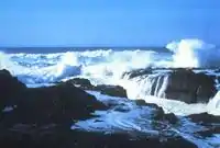 Along the Cape Perpetua coastline, there are several unique features as well. The Devils Churn is a long crack in the coastal rock that fills with each ocean wave, occasionally exploding as incoming and outgoing waves collide. The Sprouting Horn at Cook's Chasm and Thor's Well on the plateau nearby are both salt water fountains driven by the power of the ocean tide.[11] Thor's Well is at 44.278421°N 124.113499°W. Spouting Horn is at 44.277497°N 124.112994°W. Both Thor's Well and Spouting Horn are best seen approximately an hour before high tide to an hour after high tide. How spectacular the sights are is a function of the height of the high tide and the direction and size of the swells. The wind can also be a factor. Devil's Churn, Spouting Horn and Thor's Well are popular with visitors; however, all three can be dangerous, especially at high tide and during winter storms.[1]