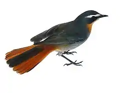 The sexes are similar. The Cape robin-chat measures 16–17 cm from bill tip to tail tip[4] and weighs 28 g.[9] The adult's upper parts are grey, with the mantle and secondary feathers tinged brownish olive. The blackish lores and ear coverts are separated from the crown by a prominent white supercilium.[9] The chin, throat, central breast, rump, upper tail coverts and outer tail feathers are orange. The breast plumage moults to a deeper orange in colour for the non-breeding season.[3] The central tail feathers are greyish-brown, and obscures the bright rufous outer tail feathers when the tail is closed. The belly is pale grey to white, and the undertail coverts buffy.[9] The short, black bill is fairly straight, but with a slightly down-curved upper mandible. The legs and feet are black, and the eye is brown.