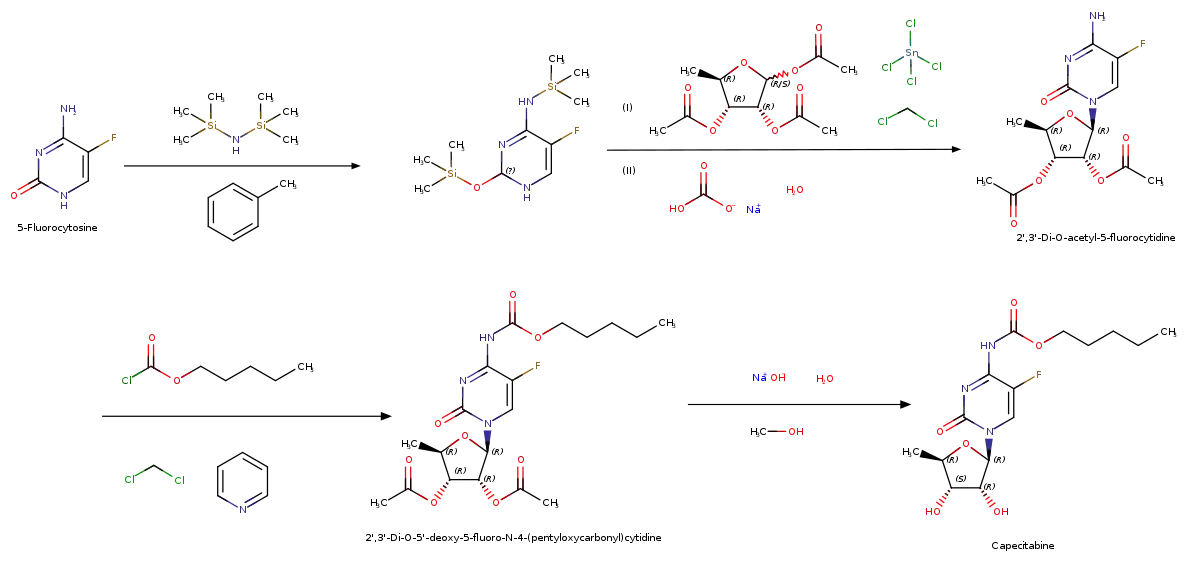 | Metabolism | liver, to 5'-DFCR, 5'-DFUR (inactive); neoplastic tissue, 5'-DFUR to active fluorouracil |