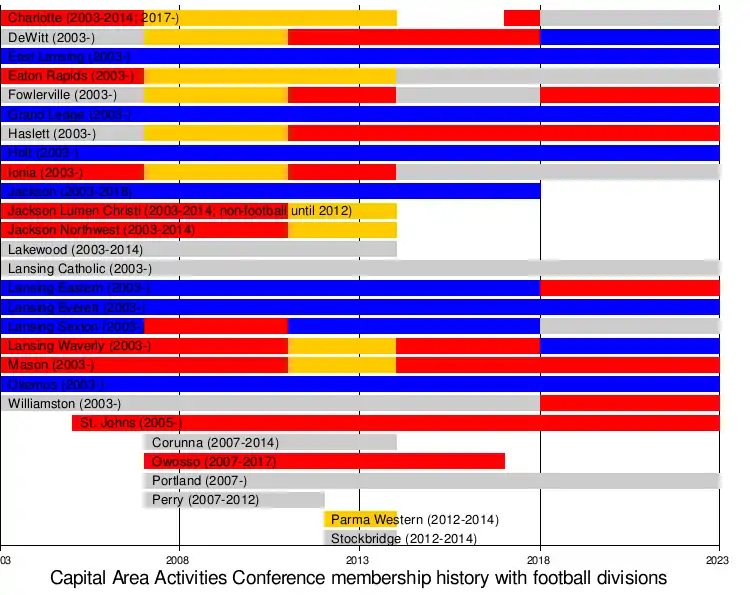 The CAAC was created in 2003, consisting of 21 schools coming from the now defunct leagues of the Capital Area Conference, the Capital Circuit League, the Ingham County League, and the Mid-Michigan Athletic Conference. From 2003 to 2007 the conference was made up of three divisions (I, II, III): division I was made up of eight schools, divisions II was made up of seven schools, and division III was made up of six schools in each. At the start of the 2007–08 school year the league switched from I, II, III to color-based divisions (Blue, Gold, Red, and White), due to new schools joining the league. The 2012–13 season was when the league reached its peak number of schools in the league; the league consisted of 27 schools with the same blue, gold, red, white divisions. After two years of competition of 27 schools, the league went through major re-alignment after seven schools departed the league. Lakewood and Stockbridge left the CAAC, and created a new conference with five other schools, called the Greater Lansing Athletic Conference (GLAC). Jackson area schools, Jackson Northwest, Parma Western, Jackson Lumen Christi, as well as Charlotte left the conference and created the Interstate Eight Conference. Corunna made the decision to move east and join the Genesee Area Conference (GAC). The CAAC reduced to three divisions and eliminated the gold division. Currently the blue division has eight schools, the red has six, and the white has six also.[3] Former league member Charlotte, which was one of the seven schools that left the conference at the start of the 2014–15 school year, to join the newly formed Interstate Eight Conference, will be leaving that conference and will be joining the CAAC once again at the start of the 2017–18 school year. The 2018–19 school year, the CAAC will go through re-alignment once again. DeWitt and Lansing Waverly will join the Blue, with East Lansing, Grand Ledge, Holt, Lansing Everett, and Okemos. In the Red, Fowlerville, Lansing Eastern and Williamston will be joining Haslett, Mason, and St. Johns. Charlotte and Lansing Sexton will move to the White with Eaton Rapids, Ionia, Lansing Catholic, and Portland. Jackson High School will be departing the league and join the Ann Arbor based Southeastern Conference (SEC).