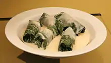 Capuns is a traditional food from the canton of Graubünden in Switzerland, predominantly made in the western part of Grisons.[1] They are made from Spätzle dough[2] with pieces of dried meat, such as air-dried beef,[3] and rolled in a chard leaf. They are boiled in a gravy of bouillon, milk and water and served covered with grated cheese.[4]
