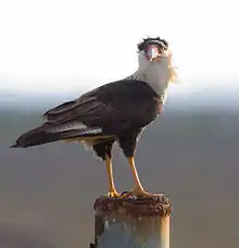Caracaras are birds of prey in the family Falconidae. They are traditionally placed in subfamily Polyborinae with the forest falcons,[1] but are sometimes considered to constitute their own subfamily, Caracarinae,[2] or classified as members of the true falcon subfamily, Falconinae.[3] Caracaras are principally birds of South and Central America, just reaching the southern United States.