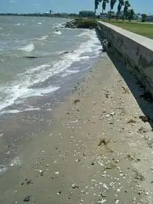 The bay is off limits to shrimping due to its legal status as a nursery, however shrimp farms have been established and approved along its shores.[9] The harvest of shellfish, particularly oysters, is heavily regulated, but allowed at certain times and places.[10] Whereas the main Matagorda Bay is an approved area for shellfish production, Carancahua Bay is divided between restricted and conditionally approved areas. The Texas Department of State Health Services described the areas conditionally approved as being from the mouth of the bay to a "beige house" on the eastern shore and cutoff across to a "grey barn" on the western shore, save for a small sliver of water that includes most of the shoreline of Port Alto, which is restricted. All areas north of the diagonal line are restricted as well.[14]