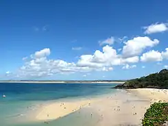 Carbis Bay (Cornish: Porth reb Tor, meaning cove beside the eminence) is a seaside resort and village (Cornish: Karrbons, meaning causeway) in Cornwall, UK. It lies one mile southeast of St Ives, on the western coast of St Ives Bay, on the Atlantic coast.[1] The South West Coast Path passes above the beach.
