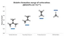 Alkyl-substituted carbocations follow the order 3° > 2° > 1° > methyl in stability, as can be inferred by the hydride ion affinity values (231, 246, 273, and 312 kcal/mol for (CH3)3C+, (CH3)2CH+, C2H5+, and CH3+).[22] The effect of alkyl substitution is a strong one: tertiary cations are stable and many are directly observable in superacid media, but secondary cations are usually transient and only the isopropyl, s-butyl, and cyclopentyl cations have been observed in solution.[23] There is seldom any experimental support for primary carbocations in the solution phase, even as transient intermediates (the ethyl cation has been proposed for reactions in 99.9% sulfuric acid and in FSO2OH-SbF5),[24] and methyl cation has only been unambiguously identified in the gas phase. In most, if not all cases, the ground state of alleged primary carbocations consist of bridged structures in which positive charge is shared by two or more carbon atoms and are better described as side-protonated alkenes, edge-protonated cyclopropanes, or corner-protonated cyclopropanes rather than true primary cations.[25][26] Even the simple ethyl cation, C2H5+, has been demonstrated experimentally and computationally to be bridged and can be thought of as a symmetrically protonated ethylene molecule. The same is true for higher homologues like 1-propyl and 1-butyl cations.[27] Neopentyl derivatives are thought to ionize with concomitant migration of a methyl group (anchimeric assistance); thus, in most if not all cases, a discrete neopentyl cation is not believed to be involved.[28]
