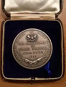In 1968, the competition joined the City of London Festival, an arts festival held in July, and the frequency changed to every two years.[4] By then, the age limit had been raised to thirty-two years. In addition to the Carl Flesch Medal, a first prize of £1000 was offered, with a second prize of £750, third prize of £500 and fourth prize of £250.[15][16] Yfrah Neaman, a pupil of both Flesch and Rostal,[5] was the director and chair from 1968; he increased the competition's standing by recruiting Yehudi Menuhin and others to serve on the jury.[3] It became a member of the World Federation of International Music Competitions in 1969.[17] In 1970 the remit broadened to include viola players,[1][4] with the first overall violist winner being Csaba Erdélyi in 1972.[18] The formal title became the City of London International Competition for Violin and Viola (Carl Flesch Medal). According to Grove's, it was then "one of the most important testing grounds for aspiring soloists up to the age of 32."[4] The music journalist Norman Lebrecht described it in 2002 as "one of the toughest violin contests".[19]