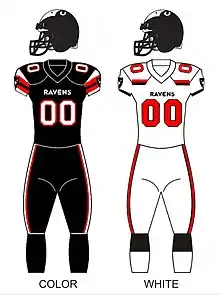 Historically, the Ravens football team first began play just after the Second World War in 1945 and was in continuous operation until the program was dropped in 1998.[2] While the team had some success in the mid-1980s, poor performances and a plan by the Carleton Athletic department to invest more funds in other sports led to the sport being cut after the 1998 season.[3][4] In their history, the Ravens won one Dunsmore Cup conference championship in 1985, but lost in the following Western Bowl to the Calgary Dinos 56 to 14.[5]