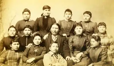 Carlisle became the model for 26 Bureau of Indian Affairs boarding schools in 15 states and territories, plus hundreds of private boarding schools sponsored by religious denominations. It has been designated a National Historic Landmark. From 1879 until 1918, over 10,000 Native American children from 140 tribes attended Carlisle.[8] The school's 1911 Annual Report included the results of an employment survey of 532 graduates and 3619 other ex-students.[9] Tribes with the largest number of students included the Lakota, Ojibwe, Seneca, Oneida, Cherokee, Apache, Cheyenne, and Alaska Native.[10] The Carlisle Indian School exemplified Progressive Era values.[11] Some believed Carlisle provided an excellent education.[12]