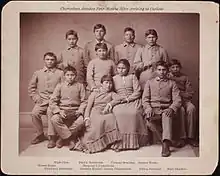 By October 1879, Captain Richard Henry Pratt had recruited the first students for the Carlisle Indian Industrial School; eighty-two boys and girls arrived one night at midnight on the eastern edge of Carlisle, and were met at the railroad station by hundreds of local residents who escorted them to the "Old Barracks".[19] The Carlisle Indian School formally opened on November 1, 1879, with an enrollment of 147 students. The youngest was six and the eldest twenty-five, but the majority were teenagers. Two-thirds were the children of Plains Indian tribal leaders. The first class was made up of eighty-four Lakota, fifty-two Cheyenne, Kiowa and Pawnee, and eleven Apache. The class included a group of students from Fort Marion who wanted to continue their education with Pratt at Carlisle.[20]