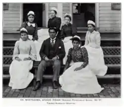 Pratt was so successful in his correspondence and methods that many Western chiefs, suffering from cold and hunger on their reservations, begged him to bring more children East. The chiefs also wrote to Washington with a request to educate more of their children.[34] News of the educational experiment spread rapidly and many came to Carlisle to volunteer services and professional talents.[34] Pratt developed a photographic record of the school for publicity and documentation. The institution and the school were photographed during the school's existence by approximately a dozen professional photographers. The first and best known photographer of the Carlisle Indian School was John Nicolas Choate.[35] After Indian dress was replaced with military uniforms and their hair was cut in Anglo fashion, the Indians' physical appearance was transformed. Pratt, in an effort to convince doubters of his beliefs, hired photographers to present this evidence. Before and after "contrast" photos were sent to officials in Washington, friends of the new school, and back to reservations to recruit new students.[36]