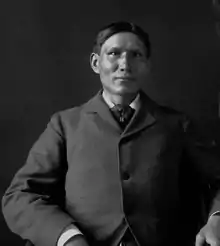 In 1883, Luther Standing Bear was sent to Philadelphia to work as an intern for John Wanamaker. Wanamaker's was the first department store in Philadelphia, Pennsylvania, and one of the first department stores in the United States. Luther was told by Pratt: "My boy you are going away from us to work for this school. Go and do your best. The majority of white people think the Indian is a lazy good-for-nothing. They think he can neither work nor learn anything; that he is very dirty. Now you are going to prove that the red man can learn and work as well as the white man. If John Wanamaker gives you the job of blacking his shoes, see that you make them shine. Then he will give you a better job. If you are put into the office to clean, don't forget to sweep up under the chairs and in the corners. If you do this well, he will give you better work to do."[61] While riding on street cars in Philadelphia, Luther did not care to listen to the vulgar language used by white boys on the way to work.[62] At the end of his internship, the entire Carlisle school students and faculty traveled to a large meeting hall in Philadelphia where Pratt and Wanamaker spoke. Luther was asked to come to the stage, and Wanamaker told the students that Luther had been promoted from one department to another every month getting better work and better money and in spite of the fact that he employed over one thousand people, he never promoted anyone as rapidly as Luther.[63]