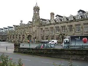 During the construction programme an iron and glass large roof was installed behind the station buildings.[3] As built, it spanned 85 metres across the platforms and tracks to cover an area in excess of 2.6 hectares. It consisted of 26 deep lattice girders, with a transverse span and 12.2 metre centres; each girder had 10 panels, stiffened end posts and a flat bottom tie.[3] The girders supported a series of slender balanced cantilever half-truss hooped beams at approximately 3.7m centres, spanning the tracks. The ornate timber end screens had Gothic-style glazing bars. The roof was glazed using shingled panels, possibly making use of Rendel's patented Indestructible System, and was designed by Edinburgh-based engineering firm Blyth & Cunningham.[3][4]