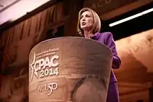 In June 2015, as a response to the U.S. Supreme Court's decision in Obergefell v. Hodges, which held that there is a fundamental right to same-sex marriage under the Fourteenth Amendment, Fiorina said the decision was "only the latest example of an activist Court. I do not agree that the Court can or should redefine marriage. I believe that responsibility should have remained with states and voters where this conversation has continued in churches, town halls and living rooms around the country."[132] In May 2015, however, she said that she hoped that the nation could support the Supreme Court's decision to legalize same-sex marriage and, at the same time, respect individual consciences.[133] In 2017, Fiorina headlined the 40th anniversary gathering of Log Cabin Republicans, an LGBT Republican organization which supports same-sex marriage and other LGBT rights.[134]